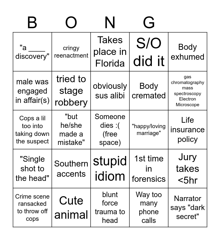 This bingo card has a free space and 69 words: Mention luminol, Life insurance policy, miDNA or DNA testing, Terrible Haircut, Cute animal, Explain what luminol does, S/O did it, interviewees praise forensics, Body exhumed, Case goes cold, Jury takes <5hr, life in prison without parole, "a ____ discovery", Takes place in Florida, Police "get a break", "but he/she made a mistake", stupid idiom, Body cremated, Cop is fat or has wildly white name, "Single shot to the head", "happy/loving marriage", 1st time in forensics, gas chromatography mass spectroscopy Electron Microscope, non-human hair or fiber found, "foul play", amazing facial hair, handwriting analysis or signature forgery, Refused or failed polygraph test, Way too many phone calls, high velocity blood splatter, cringy reenactment, Fire used to destroy evidence, not the killer's only victim, 911 caller did it, Bite mark shoe impression tire track Gun Residue, body is found, blood alcohol above legal limit, killer returned to crime scene, male was engaged in affair(s), "robbery was not motive", Southern accents, Narrator says "dark secret", Car found abandoned, Everyone unattractive, suspect suspiciously not upset enough or melodramatic, Crime scene ransacked to throw off cops, attempted clean up makes more evidence, "well-respected in the community", Crime of passion, tried to stage robbery, obviously sus alibi, love triangle, kids rat out their parents, blunt force trauma to head, Questionable "expert" title, Exotic dancer or prostitute, New partner soon after S/O death, Interviewee is author of punny-titled book, Staged crime gets dominant hand of victim wrong, Cops a lil too into taking down the suspect, Hard drive destroyed or investigated, Marital problems, kids are completely clueless, nosy or clueless neighbor, Gun is test fired, Cops laugh at own joke, smash cuts are paired with gunshot sound effects, Funny/cool investigator name and 90s 3D rendering of crime.