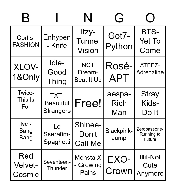 This bingo card has a free space and 24 words: Le Sserafim-Spaghetti, Seventeen-Thunder, NCT Dream-Beat It Up, Red Velvet-Cosmic, BTS-Yet To Come, Cortis-FASHION, XLOV-1&Only, Enhypen - Knife, aespa-Rich Man, Shinee-Don't Call Me, Rosé-APT, Twice- This Is For, Blackpink-Jump, Zerobaseone-Running to Future, Idle-Good Thing, EXO-Crown, Stray Kids- Do It, Itzy-Tunnel Vision, ATEEZ-Adrenaline, TXT-Beautiful Strangers, Illit-Not Cute Anymore, Ive - Bang Bang, Got7- Python and Monsta X - Growing Pains.