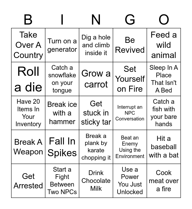 This bingo card has 204 words: Touch Grass, Kill an Enemy in One Hit, Break a Window, Drink Something, Drown, Spend 1000+ Currency, Undo Something Using Time Travel, Get Run Over, Witness an NPC Death, Set Yourself on Fire, Be Struck by Lightning, Knock an Enemy Off a Cliff, Be Knocked Off a Cliff, Cause a Chain Explosion, Blow Yourself Up, Watch an NPC Fall to Their Doom, Get Hit by a Falling Object, Drop Something from a Very High Place, Get Launched Into the Air, Launch an Enemy Into the Air, Fall Into a Trap, Survive a Trap That Should Have Killed You, Hide in Plain Sight, Escape While Being Chased, Start a Fight Between Two NPCs, Interrupt an NPC Conversation, Start a Boss Fight, Run Away from a Boss, Beat an Enemy Using the Environment, Cause an Enemy to Defeat Their Own Ally, Defeat an Enemy with Their Own Weapon, Get Arrested, Escape From Jail, Sneak Into a Restricted Area, Set Off an Alarm, Lock Someone Out of a Room, Trap an NPC Somewhere, Flood an Area, Drain an Area of Water, Freeze Something Solid, Melt Something Frozen, Collapse a Structure, Destroy a Bridge, Cause a Cave-In, Open a Secret Passage, Drop Something Heavy on an Enemy, Cook Food, Eat Something Strange, Get down to 1Hp, Heal Someone Else, Revive Someone, Be Revived, Have 20 Items In Your Inventory, Break A Weapon, Upgrade Something to the Maximum, Use a Power You Just Unlocked, Gain Something Of Rare Value, Lose a Competition, Die From a Small Fall, Reach the Edge of the Map, Find a Developer Easter Egg, Trigger a Rare Event, Cause Total Chaos in a Peaceful Area, Jump on a wooden crate, Get Stung By A Bee, Step On An Ant, Sing a song, Write your name down, Trap a monster, Wear a hat, Win A Gamble, Flush a toilet, Roll a die, Go Bald, Get A Diamond, Shoot A Gun, Fall In Spikes, Drink Chocolate Milk, Mow The Lawn, Play A Musical Instrument, Get A Perfect Score, Check The Time, Take Over A Country, Shoot A Balloon, Reach Level 25, Eat Something Rainbow Colored, Breed 2 NPCs, Grow a carrot, Build A House, Beat a boss without getting hit, Encounter the number "67", Pick a lock, Enter the sewers, Get Poisoned, Do A Backflip, Find a dinosuar, Sleep In A Place That Isn't A Bed, Undress Yourself, Read A Book, Parry A Projectile, Get an Egg, Draw A Picture Of Jerry Smith, Make A Grave For Jerry Smith, Light a campfire using flint, Catch a fish with your bare hands, Steal an apple from a market stall, Push a boulder down a hill, Break a chair by sitting on it, Open a treasure chest underwater, Hide inside a barrel, Throw a rock into a lake, Ring a large bell, Spill a bucket of water, Burn a piece of paper, Kick down a locked door, Ride an animal for the first time, Knock over three bottles with one throw, Slip on a banana peel, Get covered in mud, Slide down a snowy hill, Set off a firework, Cook meat over a fire, Melt an ice block, Break a mirror, Stack five objects on top of each other, Catch something that someone throws at you, Break a wooden bridge, Fall into quicksand, Sneak past a guard, Hide under a table, Throw something into a volcano, Hit a gong, Start a rainstorm using a machine, Turn off all the lights in a building, Spin in a chair five times, Escape from a cage, Dig a hole and climb inside it, Freeze a puddle, Break ice with a hammer, Turn a crank that opens a gate, Ride an elevator to the top floor, Bounce on a trampoline, Break a glass bottle, Catch a butterfly, Walk across a tightrope, Start a lawn mower, Hit a baseball with a bat, Slide down a ladder instead of climbing, Blow up a balloon until it pops, Turn a statue to face the opposite direction, Turn a key in a giant lock, Climb to the top of a watchtower, Jump across a broken bridge, Feed a wild animal, Knock on ten doors, Set a bear trap, Get shocked by electricity, Put out a fire with water, Turn a valve to stop leaking gas, Smash a pumpkin, Throw a snowball at someone, Freeze yourself in ice, Jump into a pile of leaves, Escape a maze, Catch a falling object before it hits the ground, Fall through a trapdoor, Use a magnet to pull something metal, Balance on one foot for ten seconds, Walk across hot coals, Get launched from a catapult, Break a lock with a hammer, Drop something from the top of a tower, Throw a dart at a dartboard, Push a minecart down a track, Stand under a waterfall, Find a hidden button on a wall, Drink from a fountain, Use binoculars to spot something far away, Bounce a ball exactly three times, Break a wooden crate with a kick, Pull a sword out of a stone, Turn a globe and stop it with your finger, Blow a whistle, Hang a picture on a wall, Flip a coin and catch it, Step on a pressure plate, Climb out of a well using a rope, Turn on a spotlight, Get stuck in sticky tar, Break a plank by karate chopping it, Open a secret bookshelf door, Throw sand in someone’s eyes, Ring a doorbell, Trip over a small rock, Get tangled in vines, Catch a snowflake on your tongue, Turn on a generator, Open a crate using a crowbar, Spill ink on paper, Jump from one rooftop to another, Break a lock using lock cutters, Push a button that says “Do Not Press”, Turn off an alarm and Catch A Fish.