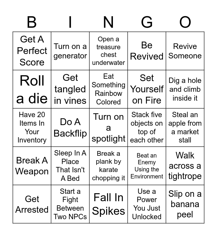 This bingo card has 200 words: Touch Grass, Kill an Enemy in One Hit, Break a Window, Drink Something, Drown, Spend 1000+ Currency, Undo Something Using Time Travel, Get Run Over, Witness an NPC Death, Set Yourself on Fire, Be Struck by Lightning, Knock an Enemy Off a Cliff, Be Knocked Off a Cliff, Cause a Chain Explosion, Blow Yourself Up, Watch an NPC Fall to Their Doom, Get Hit by a Falling Object, Drop Something from a Very High Place, Get Launched Into the Air, Launch an Enemy Into the Air, Fall Into a Trap, Survive a Trap That Should Have Killed You, Hide in Plain Sight, Escape While Being Chased, Start a Fight Between Two NPCs, Interrupt an NPC Conversation, Start a Boss Fight, Run Away from a Boss, Beat an Enemy Using the Environment, Cause an Enemy to Defeat Their Own Ally, Defeat an Enemy with Their Own Weapon, Get Arrested, Escape From Jail, Sneak Into a Restricted Area, Set Off an Alarm, Lock Someone Out of a Room, Trap an NPC Somewhere, Flood an Area, Drain an Area of Water, Freeze Something Solid, Melt Something Frozen, Collapse a Structure, Destroy a Bridge, Cause a Cave-In, Open a Secret Passage, Drop Something Heavy on an Enemy, Cook Food, Eat Something Strange, Get down to 1Hp, Heal Someone Else, Revive Someone, Be Revived, Have 20 Items In Your Inventory, Break A Weapon, Upgrade Something to the Maximum, Use a Power You Just Unlocked, Gain Something Of Rare Value, Lose a Competition, Die From a Small Fall, Reach the Edge of the Map, Find a Developer Easter Egg, Trigger a Rare Event, Cause Total Chaos in a Peaceful Area, Jump on a wooden crate, Get Stung By A Bee, Step On An Ant, Sing a song, Write your name down, Trap a monster, Wear a hat, Win A Gamble, Flush a toilet, Roll a die, Go Bald, Get A Diamond, Shoot A Gun, Fall In Spikes, Drink Chocolate Milk, Mow The Lawn, Play A Musical Instrument, Get A Perfect Score, Check The Time, Take Over A Country, Shoot A Balloon, Reach Level 25, Eat Something Rainbow Colored, Breed 2 NPCs, Grow a carrot, Build A House, Beat a boss without getting hit, Encounter the number "67", Pick a lock, Enter the sewers, Get Poisoned, Do A Backflip, Find a dinosuar, Sleep In A Place That Isn't A Bed, Undress Yourself, Read A Book, Parry A Projectile, Get an Egg, Draw A Picture Of Jerry Smith, Make A Grave For Jerry Smith, Light a campfire using flint, Catch a fish with your bare hands, Steal an apple from a market stall, Push a boulder down a hill, Break a chair by sitting on it, Open a treasure chest underwater, Hide inside a barrel, Throw a rock into a lake, Ring a large bell, Spill a bucket of water, Burn a piece of paper, Kick down a locked door, Ride an animal for the first time, Knock over three bottles with one throw, Slip on a banana peel, Get covered in mud, Slide down a snowy hill, Set off a firework, Cook meat over a fire, Melt an ice block, Break a mirror, Stack five objects on top of each other, Catch something that someone throws at you, Break a wooden bridge, Fall into quicksand, Sneak past a guard, Hide under a table, Throw something into a volcano, Hit a gong, Start a rainstorm using a machine, Turn off all the lights in a building, Spin in a chair five times, Escape from a cage, Dig a hole and climb inside it, Freeze a puddle, Break ice with a hammer, Ride an elevator to the top floor, Bounce on a trampoline, Break a glass bottle, Catch a butterfly, Walk across a tightrope, Start a lawn mower, Hit a baseball with a bat, Slide down a ladder instead of climbing, Blow up a balloon until it pops, Turn a statue to face the opposite direction, Turn a key in a giant lock, Climb to the top of a watchtower, Jump across a broken bridge, Feed a wild animal, Knock on ten doors, Set a bear trap, Get shocked by electricity, Put out a fire with water, Smash a pumpkin, Throw a snowball at someone, Freeze yourself in ice, Jump into a pile of leaves, Escape a maze, Catch a falling object before it hits the ground, Fall through a trapdoor, Use a magnet to pull something metal, Balance on one foot for ten seconds, Walk across hot coals, Get launched from a catapult, Break a lock with a hammer, Drop something from the top of a tower, Throw a dart at a dartboard, Push a minecart down a track, Stand under a waterfall, Find a hidden button on a wall, Drink from a fountain, Use binoculars to spot something far away, Bounce a ball exactly three times, Break a wooden crate with a kick, Pull a sword out of a stone, Blow a whistle, Hang a picture on a wall, Flip a coin and catch it, Step on a pressure plate, Climb out of a well using a rope, Turn on a spotlight, Get stuck in sticky tar, Break a plank by karate chopping it, Open a secret bookshelf door, Throw sand in someone’s eyes, Ring a doorbell, Trip over a small rock, Get tangled in vines, Turn on a generator, Open a crate using a crowbar, Spill ink on paper, Jump from one rooftop to another, Break a lock using lock cutters, Push a button that says “Do Not Press”, Turn off an alarm and Catch A Fish.