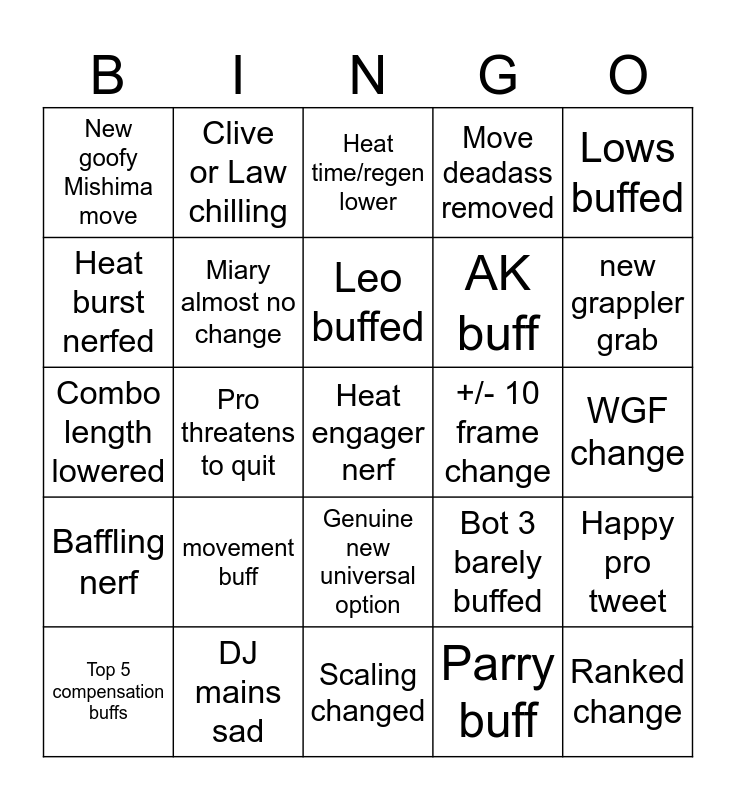 This bingo card has a free space and 24 words: movement buff, DJ mains sad, Leo buffed, Top 5 compensation buffs, Lows buffed, New goofy Mishima move, Heat burst nerfed, Clive or Law chilling, +/- 10 frame change, Genuine new universal option, AK buff, Combo length lowered, Bot 3 barely buffed, Happy pro tweet, Miary almost no change, Parry buff, WGF change, Heat time/regen lower, new grappler grab, Pro threatens to quit, Ranked change, Baffling nerf, Move deadass removed and Scaling changed.