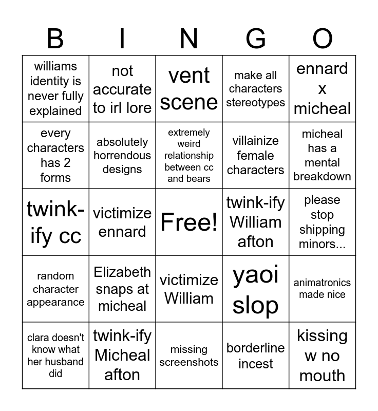 This bingo card has a free space and 24 words: Elizabeth snaps at micheal, twink-ify Micheal afton, extremely weird relationship between cc and bears, clara doesn't know what her husband did, ennard x micheal, williams identity is never fully explained, every characters has 2 forms, not accurate to irl lore, twink-ify William afton, victimize William, villainize female characters, twink-ify cc, yaoi slop, animatronics made nice, absolutely horrendous designs, borderline incest, please stop shipping minors..., vent scene, micheal has a mental breakdown, victimize ennard, kissing w no mouth, random character appearance, make all characters stereotypes and missing screenshots.