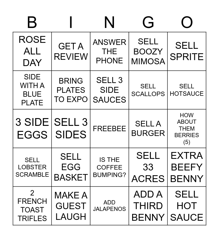 This bingo card has a free space and 24 words: SELL EGG BASKET, MAKE A GUEST LAUGH, SELL 3 SIDE SAUCES, 2 FRENCH TOAST TRIFLES, SELL SPRITE, ROSE ALL DAY, SIDE WITH A BLUE PLATE, GET A REVIEW, SELL A BURGER, IS THE COFFEE BUMPING?, SELL SCALLOPS, 3 SIDE EGGS, SELL 33 ACRES, EXTRA BEEFY BENNY, BRING PLATES TO EXPO, ADD A THIRD BENNY, HOW ABOUT THEM BERRIES (5), ANSWER THE PHONE, SELL HOTSAUCE, SELL 3 SIDES, SELL HOT SAUCE, SELL LOBSTER SCRAMBLE, SELL BOOZY MIMOSA and ADD JALAPENOS.