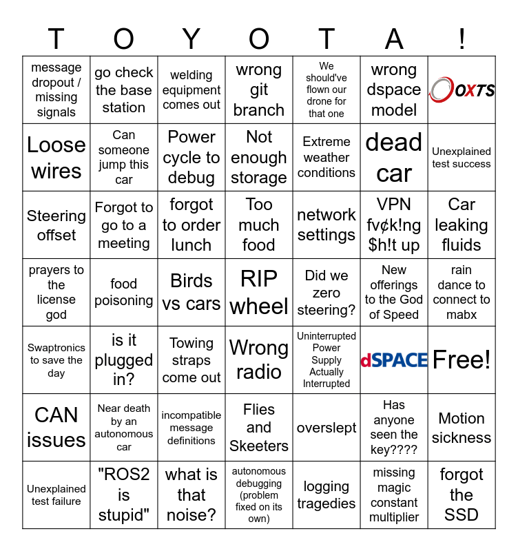 This bingo card has 2 images and 47 words: Has anyone seen the key????, dead car, logging tragedies, food poisoning, forgot to order lunch, rain dance to connect to mabx, go check the base station, what is that noise?, wrong dspace model, Wrong radio, wrong git branch, VPN fv¢k!ng $h!t up, network settings, Near death by an autonomous car, New offerings to the God of Speed, Loose wires, Unexplained test success, Motion sickness, We should've flown our drone for that one, Extreme weather conditions, Birds vs cars, message dropout / missing signals, Can someone jump this car, Unexplained test failure, Power cycle to debug, Car leaking fluids, "ROS2 is stupid", Too much food, Forgot to go to a meeting, forgot the SSD, Did we zero steering?, CAN issues, incompatible message definitions, prayers to the license god, Uninterrupted Power Supply Actually Interrupted, Free!, Steering offset, Towing straps come out, Flies and Skeeters, Swaptronics to save the day, RIP wheel, autonomous debugging (problem fixed on its own), Not enough storage, welding equipment comes out, overslept, is it plugged in? and missing magic constant multiplier.