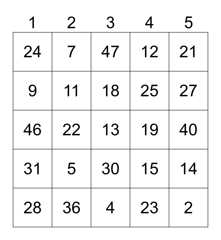 This bingo card has a free space and 49 words: 1, 2, 3, 4, 5, 6, 7, 8, 9, 10, 11, 12, 14, 15, 16, 17, 18, 19, 20, 21, 22, 23, 24, 25, 26, 27, 28, 29, 30, 31, 32, 33, 34, 35, 36, 37, 38, 39, 40, 41, 42, 43, 44, 45, 46, 47, 48, 49 and 50.