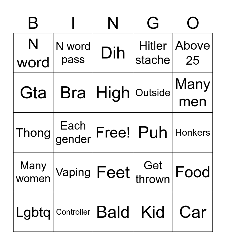 This bingo card has a free space and 24 words: Lgbtq, Vaping, High, Kid, Above 25, N word, N word pass, Dih, Puh, Honkers, Thong, Bra, Get thrown, Food, Gta, Controller, Bald, Hitler stache, Many men, Many women, Each gender, Feet, Outside and Car.