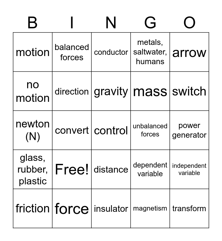 This bingo card has a free space and 24 words: Free!, force, gravity, friction, arrow, motion, no motion, balanced forces, unbalanced forces, distance, mass, newton (N), dependent variable, independent variable, direction, magnetism, power generator, conductor, switch, convert, transform, glass, rubber, plastic, metals, saltwater, humans and insulator.