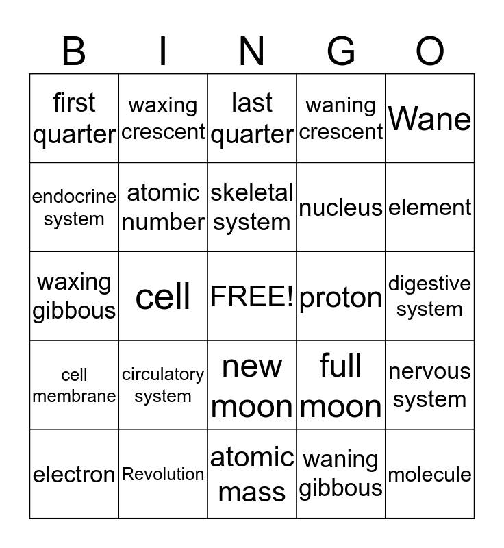 This bingo card has a free space and 24 words: circulatory system, Revolution, skeletal system, electron, Wane, first quarter, endocrine system, waxing crescent, proton, new moon, nucleus, waxing gibbous, full moon, nervous system, atomic number, waning gibbous, digestive system, last quarter, element, cell, molecule, cell membrane, waning crescent and atomic mass.