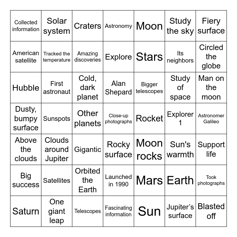 This bingo card has 49 words: Earth, Its neighbors, Sun, Sunspots, Cold, dark planet, Astronomer Galileo, Solar system, Telescopes, Study the sky, Rocky surface, Fiery surface, Astronomy, Study of space, Bigger telescopes, Satellites, Explorer 1, American satellite, Circled the globe, Took photographs, Moon, Stars, Other planets, Collected information, Tracked the temperature, Saturn, Amazing discoveries, Man on the moon, One giant leap, Alan Shepard, First astronaut, Blasted off, Rocket, Big success, Orbited the Earth, Dusty, bumpy surface, Moon rocks, Sun's warmth, Support life, Hubble, Gigantic, Launched in 1990, Above the clouds, Close-up photographs, Fascinating information, Explore, Craters, Mars, Clouds around Jupiter and Jupiter’s surface.