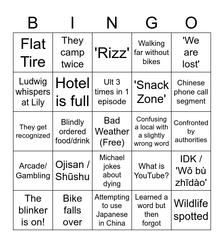 This bingo card has a free space and 24 words: Ojisan / Shūshu, Bike falls over, Ult 3 times in 1 episode, The blinker is on!, 'We are lost', Flat Tire, Ludwig whispers at Lily, They camp twice, Confusing a local with a slightly wrong word, Michael jokes about dying, 'Snack Zone', They get recognized, What is YouTube?, IDK / 'Wǒ bù zhīdào', Hotel is full, Learned a word but then forgot, Confronted by authorities, 'Rizz', Chinese phone call segment, Blindly ordered food/drink, Wildlife spotted, Arcade/ Gambling, Walking far without bikes and Attempting to use Japanese in China.