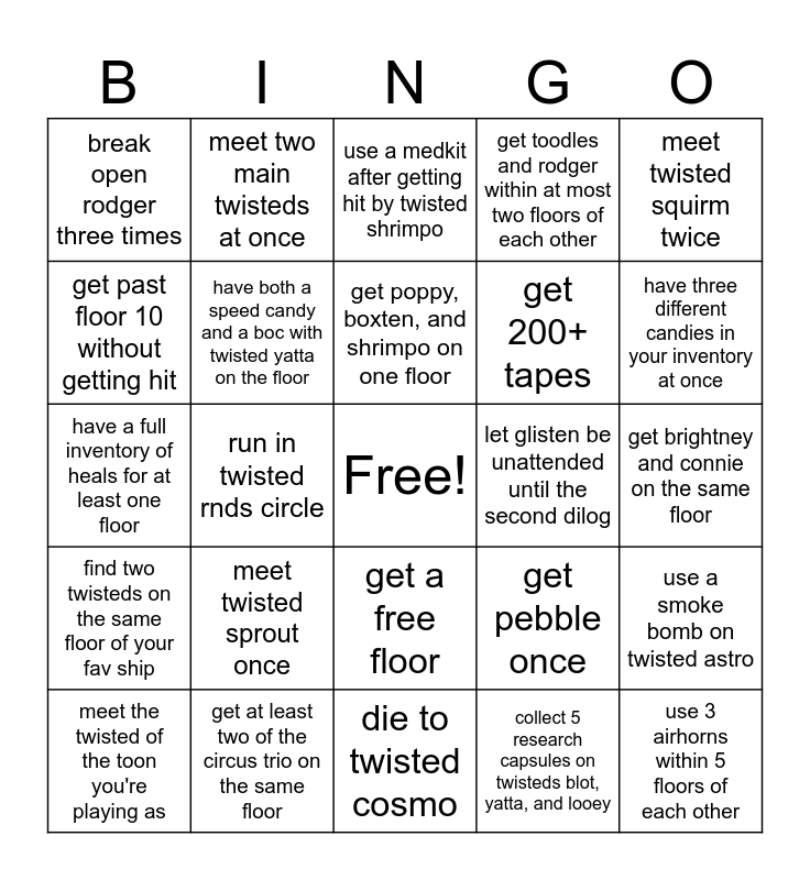 This bingo card has a free space and 24 words: meet twisted sprout once, get at least two of the circus trio on the same floor, get poppy, boxten, and shrimpo on one floor, meet the twisted of the toon you're playing as, meet twisted squirm twice, break open rodger three times, get past floor 10 without getting hit, meet two main twisteds at once, let glisten be unattended until the second dilog, get a free floor, get 200+ tapes, have a full inventory of heals for at least one floor, get pebble once, use a smoke bomb on twisted astro, have both a speed candy and a boc with twisted yatta on the floor, collect 5 research capsules on twisteds blot, yatta, and looey, get brightney and connie on the same floor, use a medkit after getting hit by twisted shrimpo, have three different candies in your inventory at once, run in twisted rnds circle, use 3 airhorns within 5 floors of each other, find two twisteds on the same floor of your fav ship, get toodles and rodger within at most two floors of each other and die to twisted cosmo.
