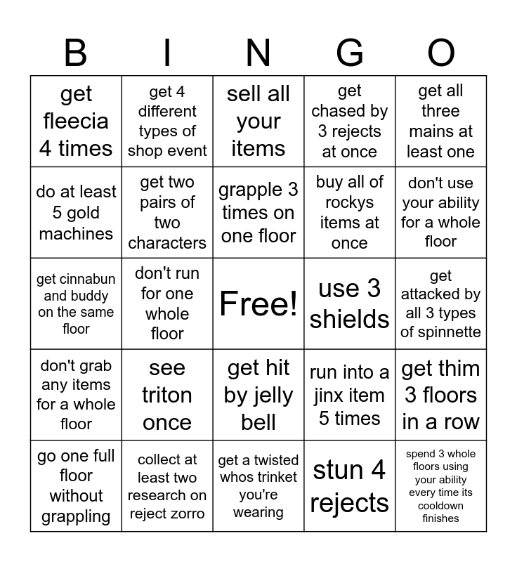 This bingo card has a free space and 24 words: see triton once, collect at least two research on reject zorro, grapple 3 times on one floor, go one full floor without grappling, get all three mains at least one, get fleecia 4 times, do at least 5 gold machines, get 4 different types of shop event, use 3 shields, get hit by jelly bell, buy all of rockys items at once, get cinnabun and buddy on the same floor, run into a jinx item 5 times, get thim 3 floors in a row, get two pairs of two characters, stun 4 rejects, get attacked by all 3 types of spinnette, sell all your items, don't use your ability for a whole floor, don't run for one whole floor, spend 3 whole floors using your ability every time its cooldown finishes, don't grab any items for a whole floor, get chased by 3 rejects at once and get a twisted whos trinket you're wearing.