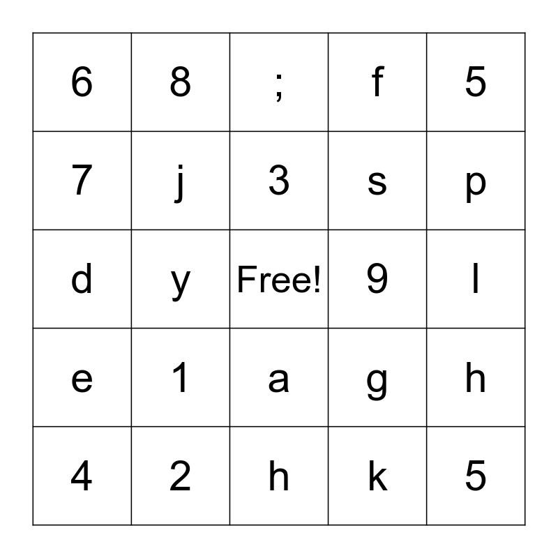 This bingo card has a free space and 24 words: 1, 2, 3, 4, 5, 6, 7, 8, 9, a, s, d, g, h, j, k, l, ;, p, y, 5, e, f and h.