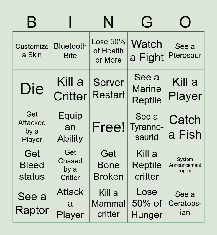 This bingo card has a free space and 29 words: See a Raptor, Grow to Adult, Equip an Ability, Kill a fish critter, Customize a Skin, Lose 50% of Health or More, Kill a Critter, Get Chased by a Critter, See a Tyranno-saurid, Attack a Player, Catch a Fish, See a Ceratops-ian, Kill a Mammal critter, Lose 50% of Hunger, Kill a Player, Lose 50% of Thirst, Get Bone Broken, Get Bleed status, See a Pterosaur, Get Attacked by a Player, Kill a Reptile critter, Get Venom status, See a Marine Reptile, Die, Watch a Fight, Bluetooth Bite, System Announcement pop-up, Server Restart and See someone AFK.
