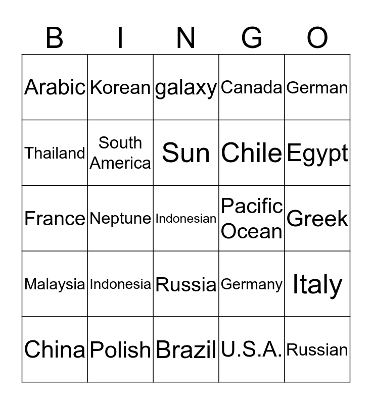 This bingo card has 71 words: Korea, Korean, Australia, English, Brazil, Portuguese, Canada, French, Chile, Spanish, China, Chinese, Egypt, Arabic, England, France, Germany, German, Greece, Greek, Indonesia, Indonesian, Italy, Italian, Turkey, Turkish, Philippines, Tagalog, Vietnam, Vietnamese, Polish, Poland, Saudi Arabia, Mexico, U.S.A., New Zealand, Japan, Japanese, Thailand, Thai, Russia, Russian, Malaysia, Malay, Portugal, North America, Asia, South America, Europe, Africa, Antarctica, Arctic Ocean, Pacific Ocean, Atlantic Ocean, Indian Ocean, Antarctic Ocean, Sun, Earth, Uranus, space station, moon, Mars, Neptune, orbit, Mercury, Jupiter, galaxy, asteroid belt, Venus, Saturn and comet.