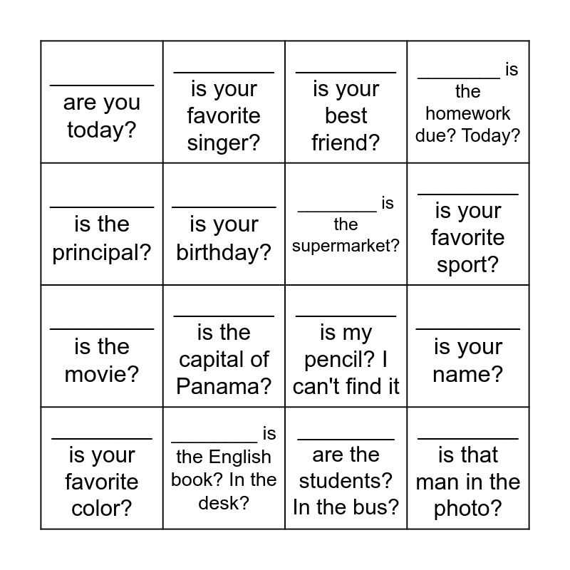 This bingo card has 20 words: ________ is your name?, ________ is the bathroom?, ________ is your best friend?, ________ is the party? Friday?, ________ is your favorite color?, ________ is the principal?, ________ is the English book? In the desk?, ________ are you today?, ________ is the movie?, ________ is your favorite singer?, ________ is the capital of Panama?, ________ is my pencil? I can't find it, ________ is your birthday?, ________ is that man in the photo?, ________ is the supermarket?, ________ is your phone number?, ________ is your favorite sport?, ________ is the homework due? Today?, ________ are the students? In the bus? and ________ is the pizza? Delicious.