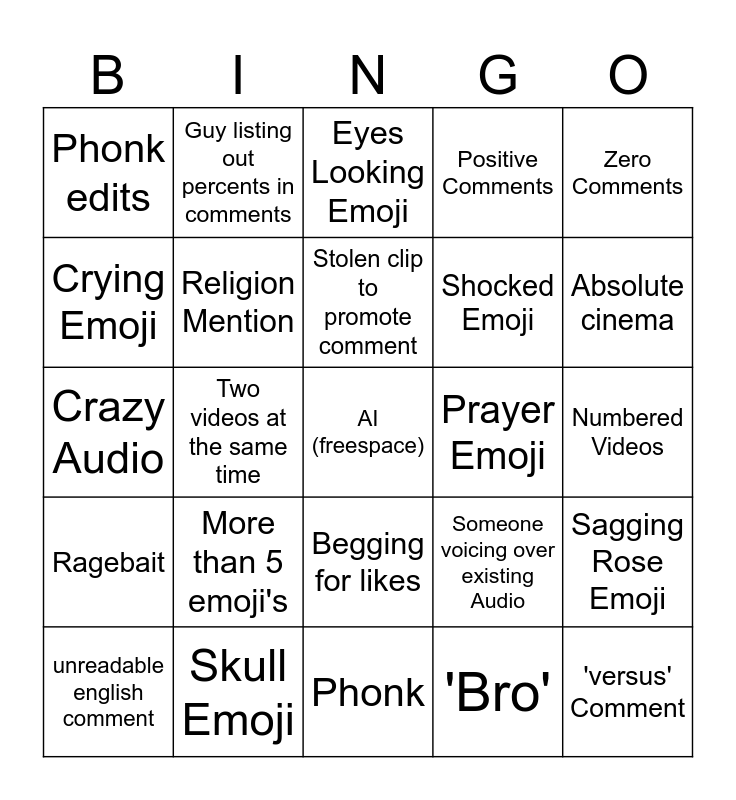 This bingo card has a free space and 24 words: More than 5 emoji's, Skull Emoji, Stolen clip to promote comment, unreadable english comment, Zero Comments, Phonk edits, Crying Emoji, Guy listing out percents in comments, Prayer Emoji, Begging for likes, Shocked Emoji, Crazy Audio, Someone voicing over existing Audio, Sagging Rose Emoji, Religion Mention, 'Bro', Numbered Videos, Eyes Looking Emoji, Absolute cinema, Two videos at the same time, 'versus' Comment, Ragebait, Positive Comments and Phonk.