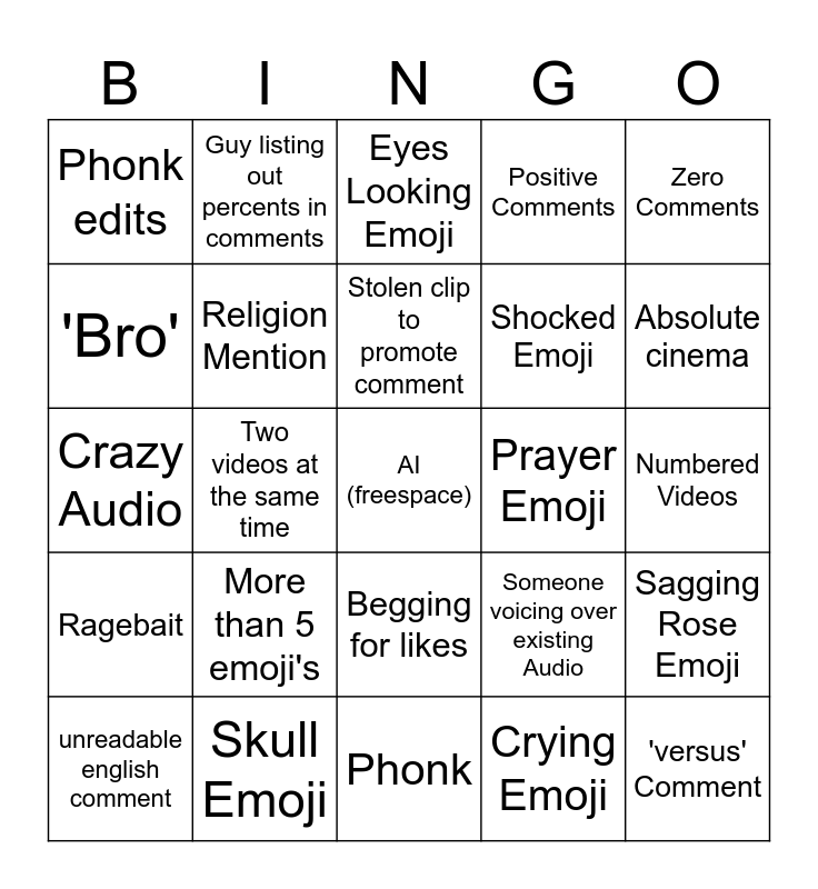 This bingo card has a free space and 24 words: More than 5 emoji's, Skull Emoji, Stolen clip to promote comment, unreadable english comment, Zero Comments, Phonk edits, 'Bro', Guy listing out percents in comments, Prayer Emoji, Begging for likes, Shocked Emoji, Crazy Audio, Someone voicing over existing Audio, Sagging Rose Emoji, Religion Mention, Crying Emoji, Numbered Videos, Eyes Looking Emoji, Absolute cinema, Two videos at the same time, 'versus' Comment, Ragebait, Positive Comments and Phonk.