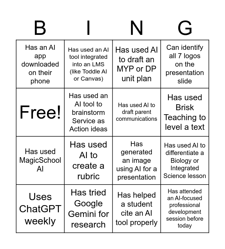 This bingo card has 17 words: Uses ChatGPT weekly, Has tried Google Gemini for research, Has used AI to draft an MYP or DP unit plan, Can identify all 7 logos on the presentation slide, Has used MagicSchool AI, Has used an AI tool to brainstorm Service as Action ideas, Has generated an image using AI for a presentation, Has used Brisk Teaching to level a text, Free!, Has used AI to create a rubric, Has helped a student cite an AI tool properly, Has used AI to differentiate a Biology or Integrated Science lesson, Has an AI app downloaded on their phone, Has used an AI tool integrated into an LMS (like Toddle AI or Canvas), Has used AI to draft parent communications, Has attended an AI-focused professional development session before today and Is brand new to Generative AI and wants to learn.