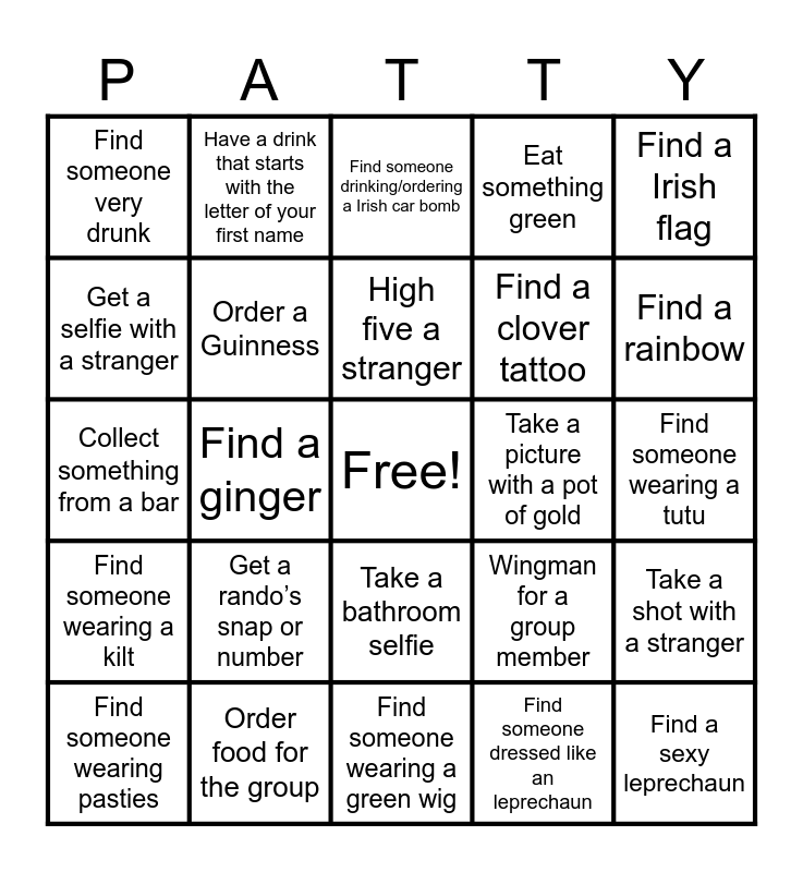 This bingo card has a free space and 34 words: Get a picture of you planking, Find someone dressed like an leprechaun, Find something that shouldn’t be green, Chug a full glass of water, Find someone wearing a kilt, Order a Guinness, Find a Irish flag, Find someone wearing pasties, Have a drink that starts with the letter of your first name, Take a photo with a stranger, High five a stranger, Find someone drinking/ordering a Irish car bomb, Find someone wearing suspenders, Find someone not wearing green, Take a picture with a pot of gold, Find a rainbow, Order food for the group, Collect something from a bar, Get a rando’s snap or number, Wingman for a group member, Take a bathroom selfie, Drink something green, Find someone very drunk, Find someone wearing a tutu, Find someone wearing a green wig, Find a sexy leprechaun, Eat something green, Find a “kiss me, I’m Irish shirt”, Find a clover tattoo, Get a selfie with a stranger, Find someone with a green beard, Find a ginger, Take a shot with a stranger and Find a gold coin.