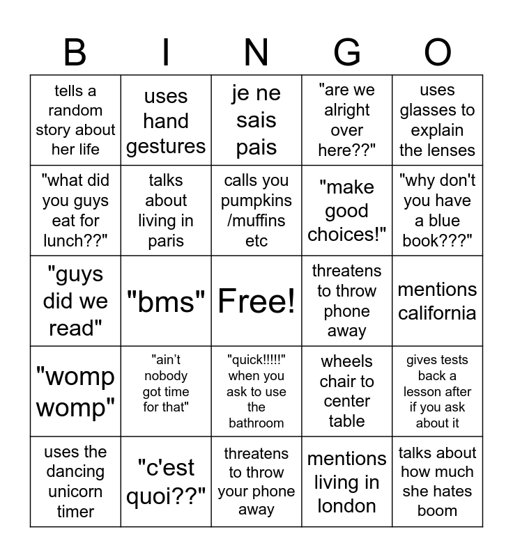 This bingo card has a free space and 24 words: "ain’t nobody got time for that", "c'est quoi??", calls you pumpkins /muffins etc, uses the dancing unicorn timer, uses glasses to explain the lenses, tells a random story about her life, "what did you guys eat for lunch??", uses hand gestures, threatens to throw phone away, "quick!!!!!" when you ask to use the bathroom, "make good choices!", "guys did we read", wheels chair to center table, gives tests back a lesson after if you ask about it, talks about living in paris, mentions living in london, mentions california, je ne sais pais, "why don't you have a blue book???", "bms", talks about how much she hates boom, "womp womp", "are we alright over here??" and threatens to throw your phone away.