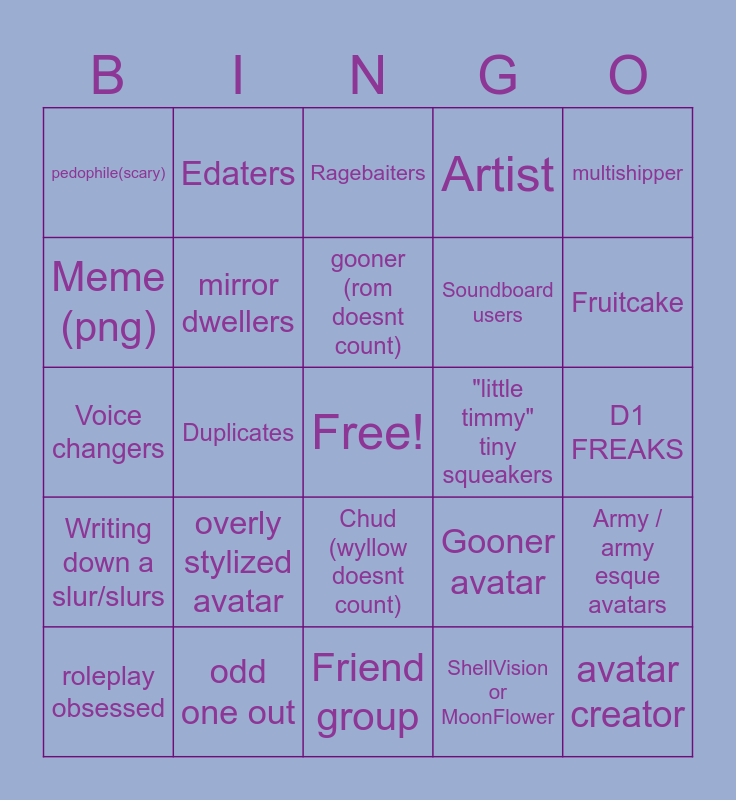 This bingo card has a free space and 24 words: overly stylized avatar, odd one out, gooner (rom doesnt count), roleplay obsessed, multishipper, pedophile(scary), Meme (png), Edaters, "little timmy" tiny squeakers, Chud (wyllow doesnt count), Soundboard users, Voice changers, Gooner avatar, Army / army esque avatars, mirror dwellers, ShellVision or MoonFlower, D1 FREAKS, Ragebaiters, Fruitcake, Duplicates, avatar creator, Writing down a slur/slurs, Artist and Friend group.
