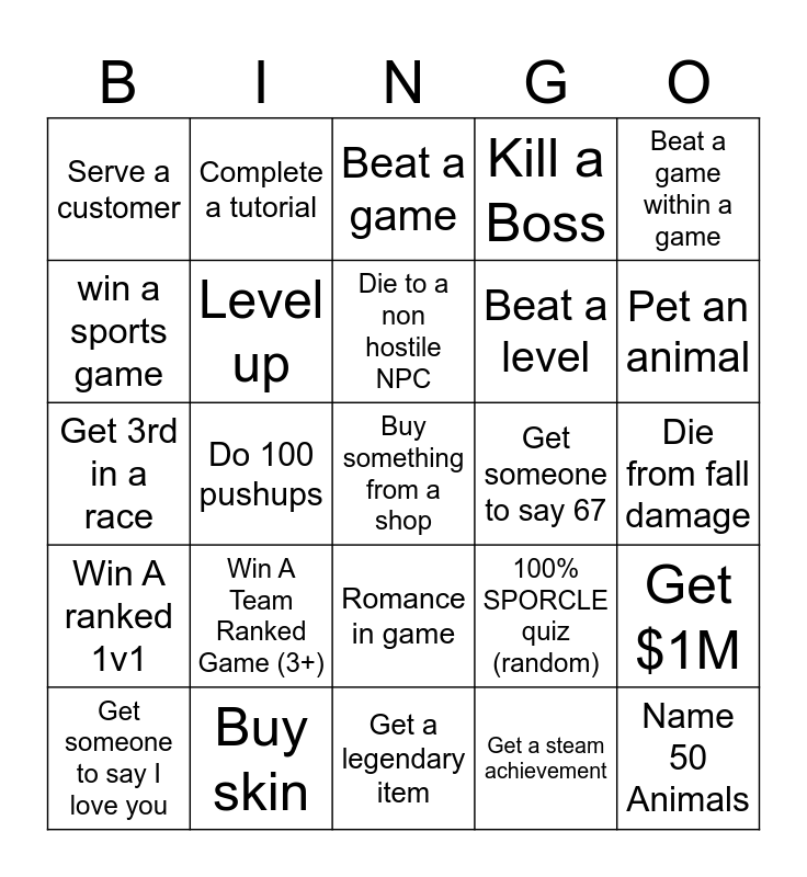 This bingo card has 25 words: Win A Team Ranked Game (3+), Get a legendary item, Die to a non hostile NPC, Get someone to say I love you, Beat a game within a game, Serve a customer, win a sports game, Complete a tutorial, Get someone to say 67, Romance in game, Beat a level, Get 3rd in a race, 100% SPORCLE quiz (random), Get $1M, Level up, Name 50 Animals, Die from fall damage, Beat a game, Pet an animal, Do 100 pushups, Buy something from a shop, Buy skin, Win A ranked 1v1, Kill a Boss and Get a steam achievement.