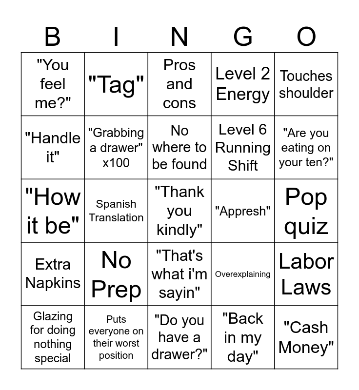 This bingo card has a free space and 24 words: No Prep, Puts everyone on their worst position, No where to be found, Glazing for doing nothing special, Touches shoulder, "You feel me?", "Handle it", "Tag", "Appresh", "That's what i'm sayin", Level 6 Running Shift, "How it be", Overexplaining, Labor Laws, "Grabbing a drawer" x100, "Back in my day", Pop quiz, Pros and cons, "Are you eating on your ten?", Spanish Translation, "Cash Money", Extra Napkins, Level 2 Energy and "Do you have a drawer?".