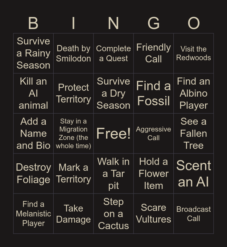This bingo card has a free space and 49 words: Join a Group, Broadcast Call, Find a Mammoth, Step on a Cactus, Mark a Territory, Hold a Meat Item, Death by Smilodon, Visit the Beach, Kill an AI animal, Death by Bison, Protect Territory, Friendly Call, Scent an AI, Hold a Flower Item, Get in a Fight, Enter a Cave, Survive a Dry Season, Aggressive Call, Drop Below 50% health, Visit the Redwoods, Stay in a Migration Zone (the whole time), Scare Vultures, Survive a Rainy Season, Find a Fossil, Find an Albino AI, Find an Albino Player, Find a Melanistic Player, Swim Across a River, Walk in a Tar pit, Destroy Foliage, Scent Droppings, Scent a Body, Successfully Hunt an AI, Kill a Player, Take Damage, Scent a Carnivore, Eat from a Mineral Lick, Find a Mammoth Skull, See a Fallen Tree, Enter Spook Mode, Run from an Attacker, Latch onto a Player, Witness a Death by Peccary, Take Fall Damage, Add a Name and Bio, Complete a Quest, Spot Prey or Predator, Hear a Wolf Howl and Hear a Smilo Call.