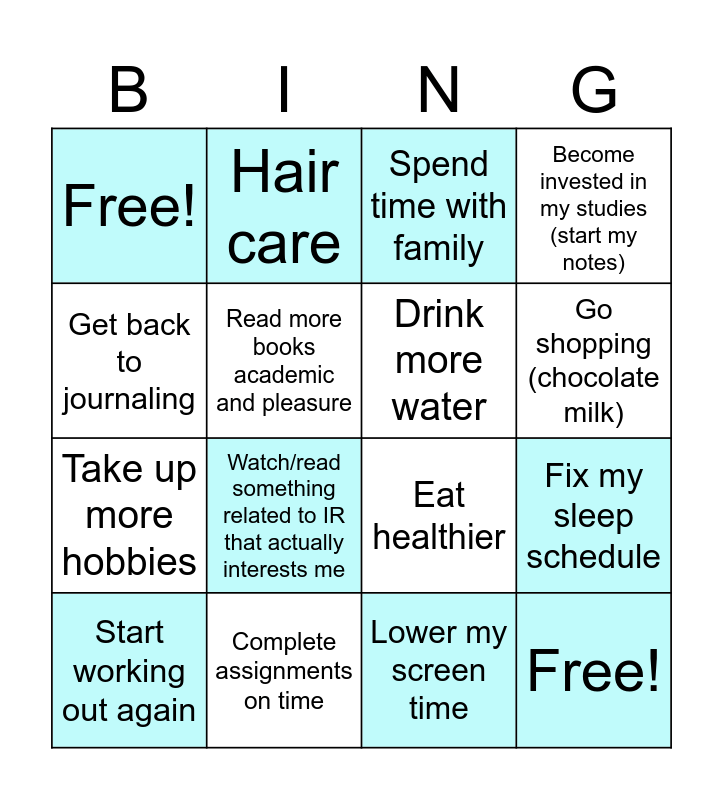 This bingo card has 16 words: Start working out again, Complete assignments on time, Spend time with family, Become invested in my studies (start my notes), Get back to journaling, Hair care, Eat healthier, Fix my sleep schedule, Free!, Read more books academic and pleasure, Lower my screen time, Go shopping (chocolate milk), Take up more hobbies, Watch/read something related to IR that actually interests me, Drink more water and Free!.