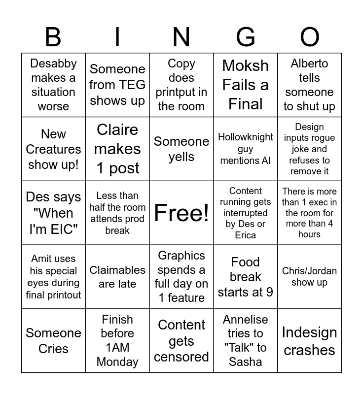 This bingo card has a free space and 29 words: Someone Cries, Printout is delayed, Less than half the room attends prod break, Graphics finishes at 10pm on Sunday, Desabby makes a situation worse, Copy does printput in the room, Claire makes 1 post, Claimables are late, Content running gets interrupted by Des or Erica, Finish before 1AM Monday, There is more than 1 exec in the room for more than 4 hours, Indesign crashes, Content gets censored, Annelise tries to "Talk" to Sasha, Design inputs rogue joke and refuses to remove it, Gmos something that was ran, Graphics spends a full day on 1 feature, Amit uses his special eyes during final printout, Alberto tells someone to shut up, Des says "When I'm EIC", Food break starts at 9, Really ugly special issue page, Hollowknight guy mentions AI, New Creatures show up!, Moksh Fails a Final, Someone from TEG shows up, Chris/Jordan show up, Someone yells and Cole has date with Marcello and can't show up to a prod day because of it.