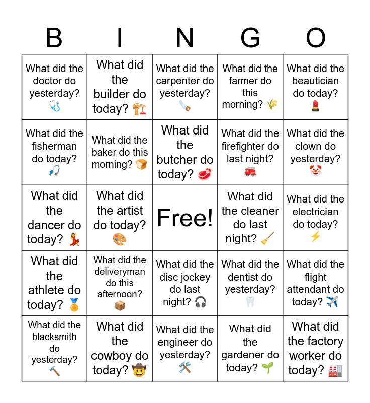 This bingo card has a free space and 33 words: What did the actor do yesterday? ๐ญ, What did the archaeologist do today? ๐บ, What did the artist do today? ๐จ, What did the astronaut do yesterday? ๐, What did the athlete do today? ๐ , What did the baker do this morning? ๐, What did the beautician do today? ๐, What did the blacksmith do yesterday? ๐จ, What did the builder do today? ๐๏ธ, What did the bus driver do this morning? ๐, What did the butcher do today? ๐ฅฉ, What did the carpenter do yesterday? ๐ช, What did the cashier do today? ๐ต, What did the chef do today? ๐จโ๐ณ, What did the cleaner do last night? ๐งน, What did the clown do yesterday? ๐คก, What did the cowboy do today? ๐ค , What did the dancer do today? ๐, What did the deliveryman do this afternoon? ๐ฆ, What did the dentist do yesterday? ๐ฆท, What did the disc jockey do last night? ๐ง, What did the diver do today? ๐คฟ, What did the doctor do yesterday? ๐ฉบ, What did the electrician do today? โก, What did the engineer do yesterday? ๐ ๏ธ, What did the factory worker do today? ๐ญ, What did the farmer do this morning? ๐พ, What did the firefighter do last night? ๐, What did the fisherman do today? ๐ฃ, What did the flight attendant do today? โ๏ธ, What did the florist do this morning? ๐, What did the gardener do today? ๐ฑ and What did the hairdresser do yesterday? โ๏ธ.