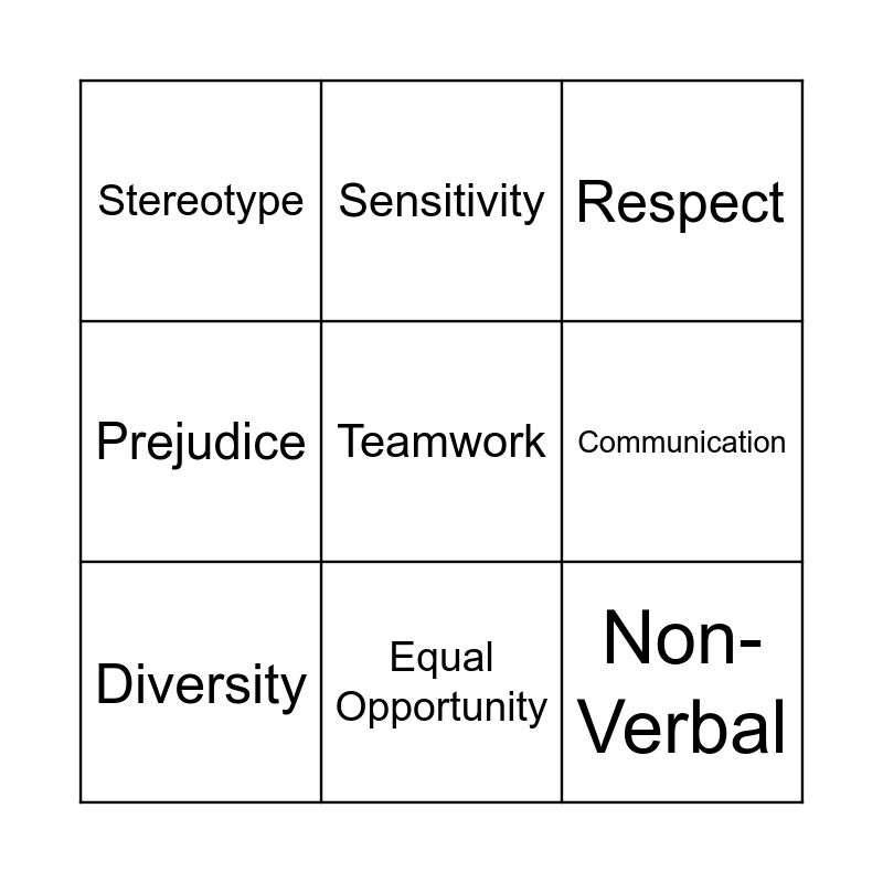 This bingo card has 9 words: Diversity, Respect, Sensitivity, Prejudice, Stereotype, Communication, Teamwork, Non-Verbal and Equal Opportunity.