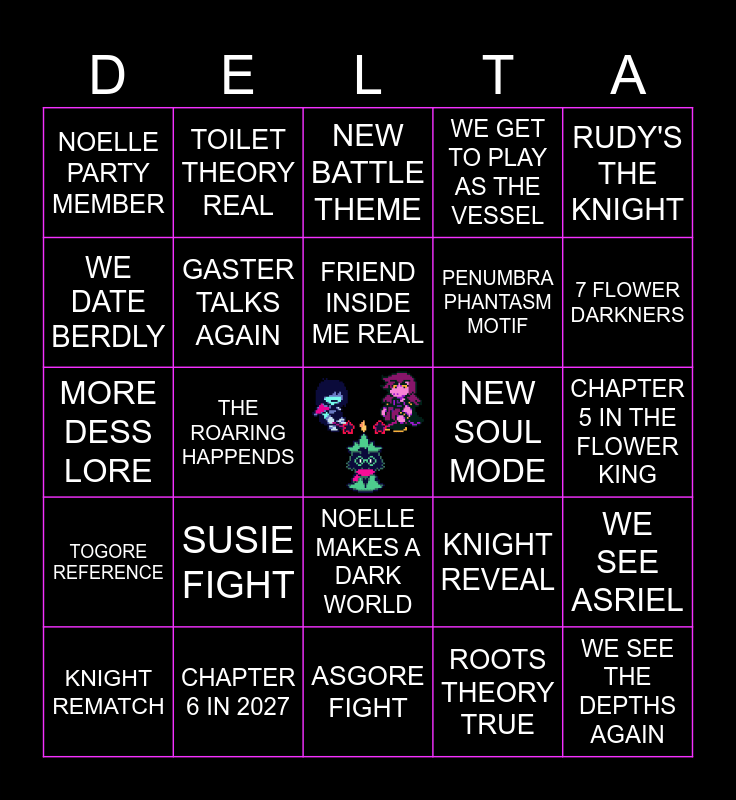 This bingo card has a free space and 24 words: KNIGHT REMATCH, SUSIE FIGHT, FRIEND INSIDE ME REAL, ROOTS THEORY TRUE, RUDY'S THE KNIGHT, NOELLE PARTY MEMBER, TOILET THEORY REAL, NEW BATTLE THEME, NEW SOUL MODE, CHAPTER 5 IN THE FLOWER KING, MORE DESS LORE, GASTER TALKS AGAIN, KNIGHT REVEAL, WE SEE ASRIEL, WE DATE BERDLY, CHAPTER 6 IN 2027, ASGORE FIGHT, WE GET TO PLAY AS THE VESSEL, 7 FLOWER DARKNERS, TOGORE REFERENCE, THE ROARING HAPPENDS, NOELLE MAKES A DARK WORLD, PENUMBRA PHANTASM MOTIF and WE SEE THE DEPTHS AGAIN.