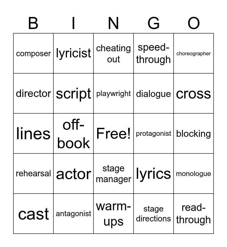 This bingo card has a free space and 24 words: actor, antagonist, playwright, cast, choreographer, composer, director, lyricist, protagonist, stage manager, dialogue, lines, lyrics, monologue, script, stage directions, blocking, cheating out, cross, off-book, read-through, rehearsal, speed-through and warm-ups.
