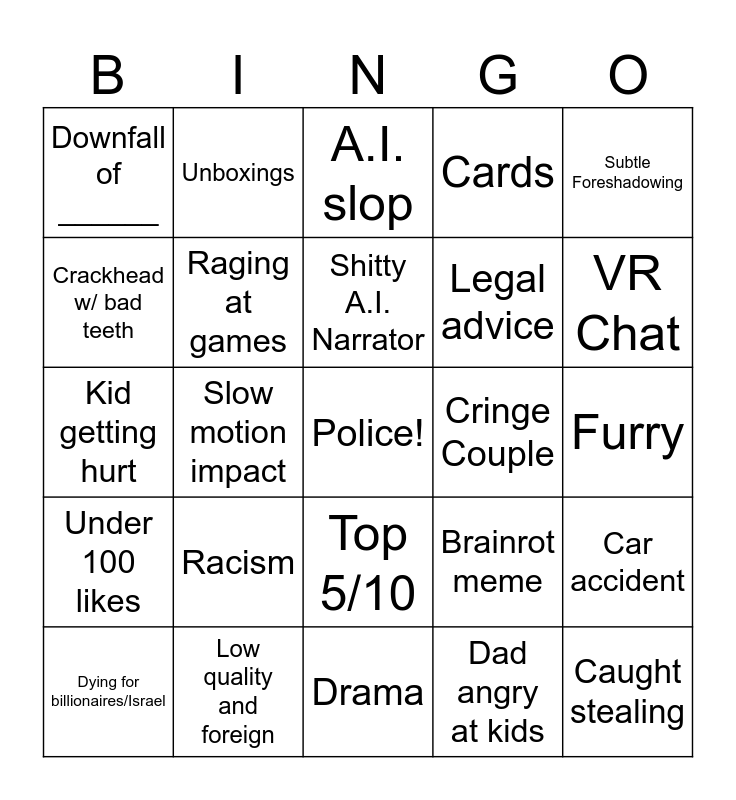 This bingo card has a free space and 24 words: Racism, Low quality and foreign, Shitty A.I. Narrator, Dying for billionaires/Israel, Subtle Foreshadowing, Downfall of ______, Crackhead w/ bad teeth, Unboxings, Cringe Couple, Top 5/10, Legal advice, Kid getting hurt, Brainrot meme, Car accident, Raging at games, Dad angry at kids, Furry, A.I. slop, VR Chat, Slow motion impact, Caught stealing, Under 100 likes, Cards and Drama.