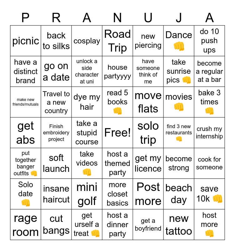 This bingo card has a free space and 54 words: host a dinner party, Travel to a new country, concert, solo trip, read 5 books 👊, Solo date 👊, Road Trip, Festival, Dance 👊, insane haircut, picnic, become strong, get abs, bake 3 times 👊, save 10k 👊, Finish embroidery project, take sunrise pics 👊, go on a date, get a boyfriend, make new friends/mutuals, move flats, find 3 new restaurants 👊, become a regular at a bar, new piercing, new tattoo, back to silks, take videos 👊, get a new phone, crush my internship, take a stupid course, complete a certificate, get my licence, beach day, rage room, cosplay, cook for someone, house partyyyy, movies 👊, host more 👊, do 10 push ups, mini golf, more closet basics, Post more, quit my job, dye my hair, cut bangs, host a themed party, put together banger outfits 👊, have a distinct brand, have someone think of me, unlock a side character at uni, get urself a treat 👊, soft launch and take more selfies 👊.