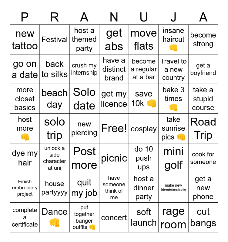 This bingo card has a free space and 48 words: host a dinner party, Travel to a new country, concert, solo trip, Solo date, Road Trip, Festival, Dance 👊, insane haircut 👊, picnic, become strong, get abs, bake 3 times 👊, save 10k 👊, Finish embroidery project, take sunrise pics 👊, go on a date, get a boyfriend, make new friends/mutuals, move flats, become a regular at a bar, new piercing, new tattoo, back to silks, get a new phone, crush my internship, take a stupid course, complete a certificate, get my licence, beach day, rage room, cosplay, cook for someone, house partyyyy, host more 👊, do 10 push ups, mini golf, more closet basics, Post more, quit my job, dye my hair, cut bangs, host a themed party, put together banger outfits 👊, have a distinct brand, have someone think of me, unlock a side character at uni and soft launch.