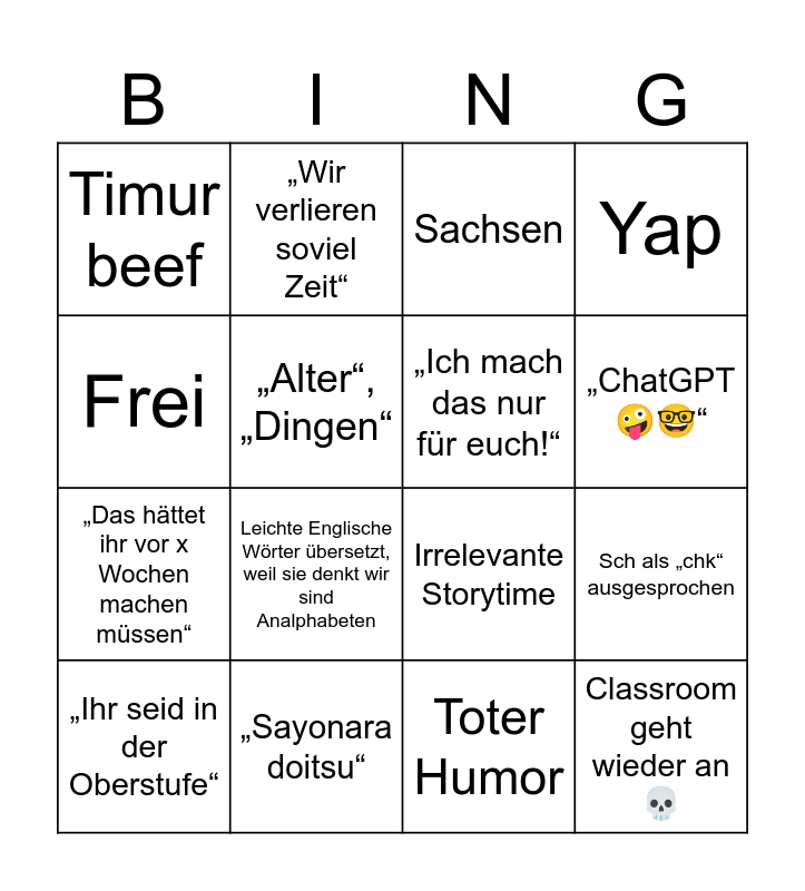 This bingo card has 16 words: „Sayonara doitsu“, Sch als „chk“ ausgesprochen, Sachsen, Timur beef, „Das hättet ihr vor x Wochen machen müssen“, „Wir verlieren soviel Zeit“, Irrelevante Storytime, Toter Humor, Frei, „Alter“, „Dingen“, „Ihr seid in der Oberstufe“, Yap, Leichte Englische Wörter übersetzt, weil sie denkt wir sind Analphabeten, „ChatGPT🤪🤓“, „Ich mach das nur für euch!“ and Classroom geht wieder an💀.