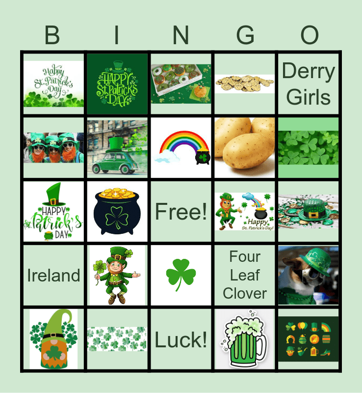This bingo card has 29 images, a free space and 10 words: Dublin, Derry, Derry Girls, Ireland, Four Leaf Clover, Luck!, Shamrock, Gold, Leprechaun and Irish.