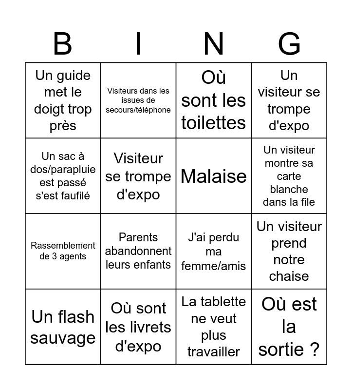 This bingo card has 20 words: Un visiteur prend notre chaise, Problème d'audioguide, Où sont les toilettes, Un visiteur montre sa carte blanche sans un mot, Un flash sauvage, Un sac à dos/parapluie est passé s'est faufilé, Où sont les livrets d'expo, Un guide met le doigt trop près, Rassemblement de 3 agents, Visiteurs dans les issues de secours/téléphone, Parents abandonnent leurs enfants, J'ai perdu ma femme/amis, Visiteur se trompe d'expo, Où est la sortie ?, Malaise, La sorcière d'Orsay revient encore une fois, Un visiteur montre sa carte blanche dans la file, Un visiteur se trompe d'expo, La tablette ne veut plus travailler and "C'est où l'expo dessin".