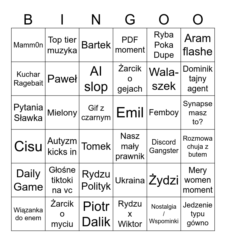 This bingo card has 36 words: Ukraina, Rydzu Polityk, Rydzu x Wiktor, Kuchar Ragebait, Cisu, Emil, Paweł, Piotr Dalik, Ryba Poka Dupe, Żydzi, Dominik tajny agent, PDF moment, Mery women moment, Mielony, Żarcik o gejach, Mamm0n, Daily Game, Femboy, Pytania Sławka, Bartek, Gif z czarnym, Autyzm kicks in, Nasz mały prawnik, Tomek, Discord Gangster, Top tier muzyka, Wala-szek, Żarcik o myciu, AI slop, Aram flashe, Jedzenie typu gówno, Wiązanka do enem, Rozmowa chuja z butem, Synapse masz to?, Głośne tiktoki na vc and Nostalgia / Wspominki.