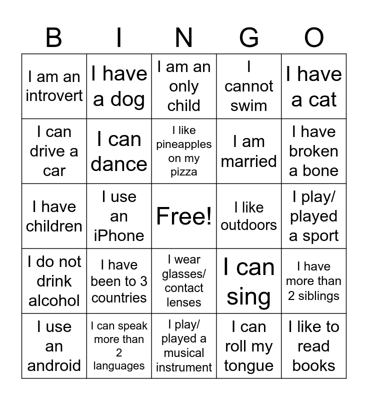 This bingo card has a free space and 24 words: I have been to 3 countries, I can speak more than 2 languages, I like pineapples on my pizza, I use an android, I have a cat, I am an introvert, I can drive a car, I have a dog, I like outdoors, I wear glasses/ contact lenses, I am married, I have children, I can sing, I have more than 2 siblings, I can dance, I can roll my tongue, I play/ played a sport, I am an only child, I have broken a bone, I use an iPhone, I like to read books, I do not drink alcohol, I cannot swim and I play/ played a musical instrument.