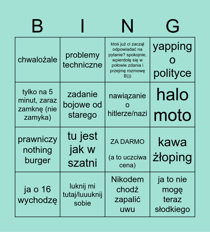 This bingo card has 26 words: żul, jakiś naćpany, halo moto, otworzymy okno? jakoś duszno tutaj, tylko na 5 minut, zaraz zamknę (nie zamyka), chwalożale, zadanie bojowe od starego, problemy techniczne, Nikodem chodź zapalić uwu, możesz podejść?, prawniczy nothing burger, ZA DARMO (a to uczciwa cena), bieganie mentioned, jakoś sennie dzisiaj, kawa żłoping, tiktoczkowanie, yapping o polityce, ja to nie mogę teraz słodkiego, ktoś już ci zaczął odpowiadać na pytanie? spokojnie, wpierdolę się w połowie zdania i przejmę rozmowę B))), ja o 16 wychodzę, tu jest jak w szatni, ojjj tak szybko czas mija, już 16, luknij mi tutaj/luuuknij sobie, helpdesk AML edition, nawiązanie o hitlerze/nazi and piwo to moje paliwo.