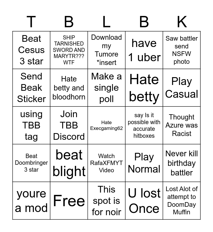This bingo card has a free space and 24 words: beat blight, Free, Make a single poll, youre a mod, Saw battler send NSFW photo, Beat Cesus 3 star, Send Beak Sticker, SHIP TARNISHED SWORD AND MARYTR??? WTF, say Is it possible with accurate hitboxes, Watch RafaXFMYT Video, Hate betty, using TBB tag, Play Normal, Never kill birthday battler, Hate betty and bloodhorn, U lost Once, Thought Azure was Racist, Download my Tumore *insert, Play Casual, Join TBB Discord, Lost Alot of attempt to DoomDay Muffin, Beat Doombringer 3 star, have 1 uber and This spot is for noir.