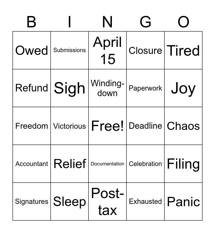 This bingo card has a free space and 24 words: Relief, Sleep, Winding-down, Signatures, Tired, Owed, Refund, Submissions, Deadline, Documentation, Paperwork, Freedom, Celebration, Filing, Sigh, Exhausted, Chaos, April 15, Joy, Victorious, Panic, Accountant, Closure and Post-tax.