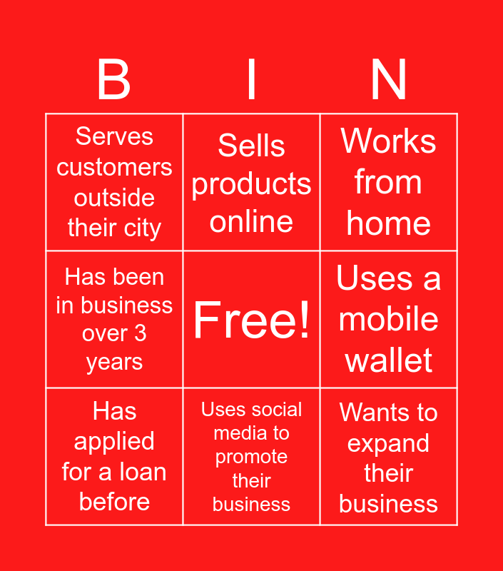 This bingo card has a free space and 8 words: Has been in business over 3 years, Sells products online, Uses a mobile wallet, Has applied for a loan before, Works from home, Serves customers outside their city, Uses social media to promote their business and Wants to expand their business.