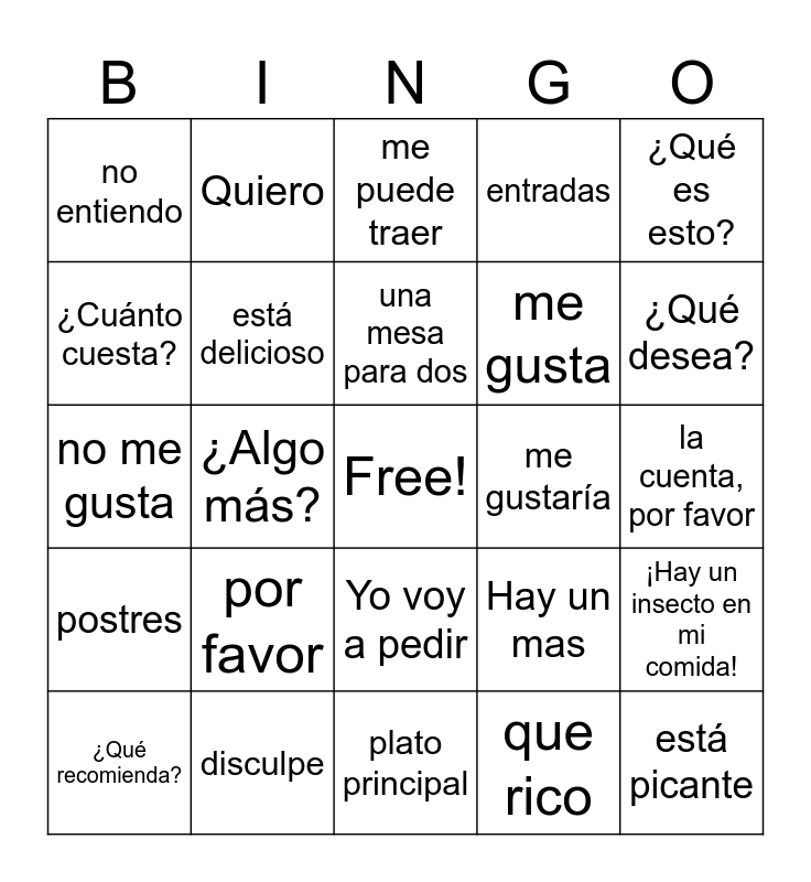 This bingo card has a free space and 24 words: por favor, disculpe, una mesa para dos, ¿Qué recomienda?, ¿Qué es esto?, no entiendo, ¿Cuánto cuesta?, Quiero, me gustaría, Yo voy a pedir, me gusta, no me gusta, Hay un mas, ¡Hay un insecto en mi comida!, está delicioso, que rico, la cuenta, por favor, me puede traer, ¿Qué desea?, ¿Algo más?, está picante, postres, entradas and plato principal.