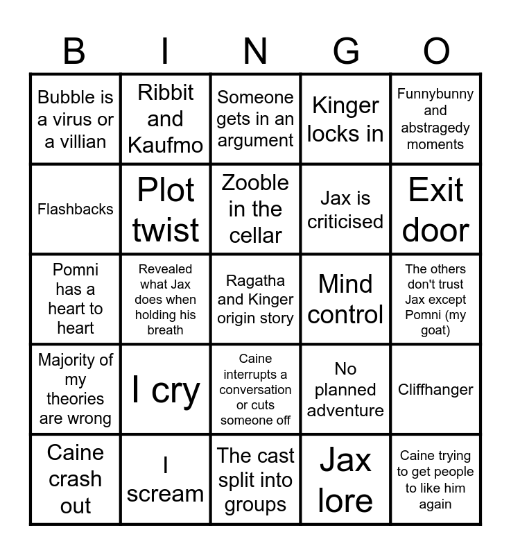 This bingo card has a free space and 24 words: I cry, I scream, Zooble in the cellar, Caine crash out, Funnybunny and abstragedy moments, Bubble is a virus or a villian, Flashbacks, Ribbit and Kaufmo, Mind control, Caine interrupts a conversation or cuts someone off, Jax is criticised, Pomni has a heart to heart, No planned adventure, Cliffhanger, Plot twist, Jax lore, The others don't trust Jax except Pomni (my goat), Someone gets in an argument, Exit door, Revealed what Jax does when holding his breath, Caine trying to get people to like him again, Majority of my theories are wrong, Kinger locks in and The cast split into groups.