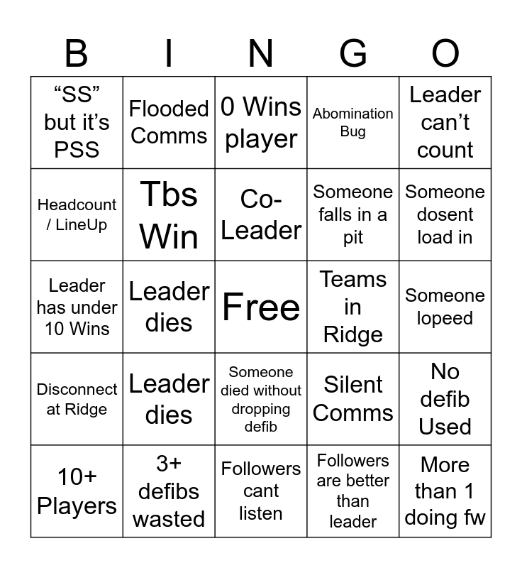 This bingo card has a free space and 38 words: In lobby for 15+ Minutes, Back Leader, Troller, Tbs Win, No defib Used, Leader dies, Co-Leader, Someone goes commless, Leader can’t count, Someone falls in a pit, Leader dies, Abomination Bug, More than 1 doing fw, Someone lopeed, Headcount / LineUp, Disconnect at Ridge, Someone dies at searchlights, 0 Wins player, Someone 10+ minute AFK, Teams in Ridge, “SS” but it’s PSS, 3+ defibs wasted, Someone dosent load in, 10+ Players, First GE in 15+ minutes, Followers cant listen, 4+ Front Followers, Someone leaves mid run, Someone Blacklisted, PSS that isn’t PSS, One defib left, Someone died without dropping defib, Followers are better than leader, Flooded Comms, Cooked Comms, Silent Comms, Leader has under 10 Wins and Bullet.